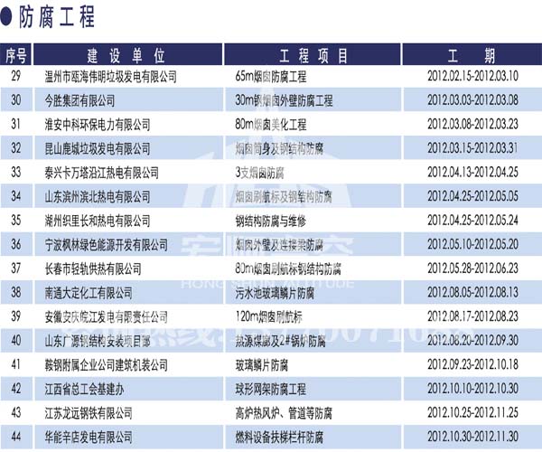 宏順建設(shè)工程有限公司是國家批準(zhǔn)成立的專業(yè)高空作業(yè)企業(yè):承攬過(國內(nèi).國外)煙囪新建、煙囪防腐、吊機(jī)防腐、水塔防腐、管道防腐、龍門吊防腐、儲(chǔ)存罐防腐、煙囪內(nèi)壁防腐等高空作業(yè)工程。具有“不搭腳手架 、 不需要停產(chǎn)”施工特點(diǎn)。